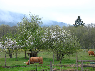 Yesterday we bought another role of 1/4 inch polyrope hotwire, grabbed the rest of our temporary step in posts, and added a new temporary cross fence. After opening what was the previous front fence (and is now the back fence), we herded the cattle through. Natalie led the way (of course), followed by a nervous Bridgit and the calves. Sheila was trying to determine what was in it for her, thinking we had a treat, so was lagging behind checking us out. Once she realized the others had found green gold, however, she kicked up her heels and tore into the new paddock. All mouths immediately made contact with the taller grass under the apple trees, and they blissfully grazed into darkness. We were pleased. and judging from their grazing behavior today, so are they. For now, until the rest of our grass really gets its growth on, we'll keep them here and feed them hay to keep them happy and nourished. The remainder of our pasture can be split in half when we've got a little more growth. We should be able to rotate them through the main sacrifice paddock once with hay for feed if needed, as by then the mud should be dry. If this lease deal works, then we'll be able to move them through the neighboring pasture - which we'll cross fence for rotational grazing - in mid- to late-May.